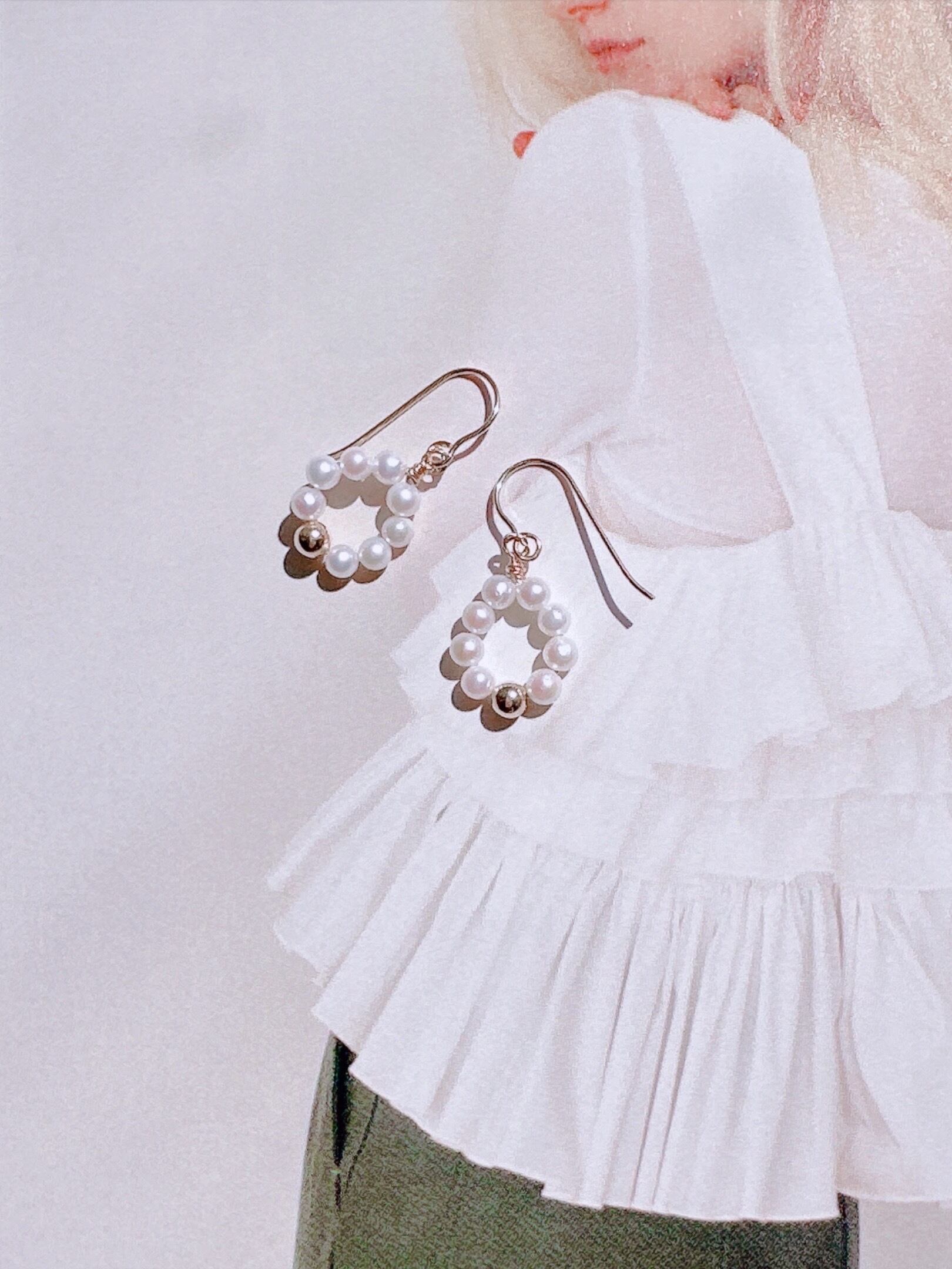 およそ3㎜の淡水真珠のループする小さなパールピアスは日常使いしやすく、さり気ない上品さと華奢さを引き立てててくれます。
